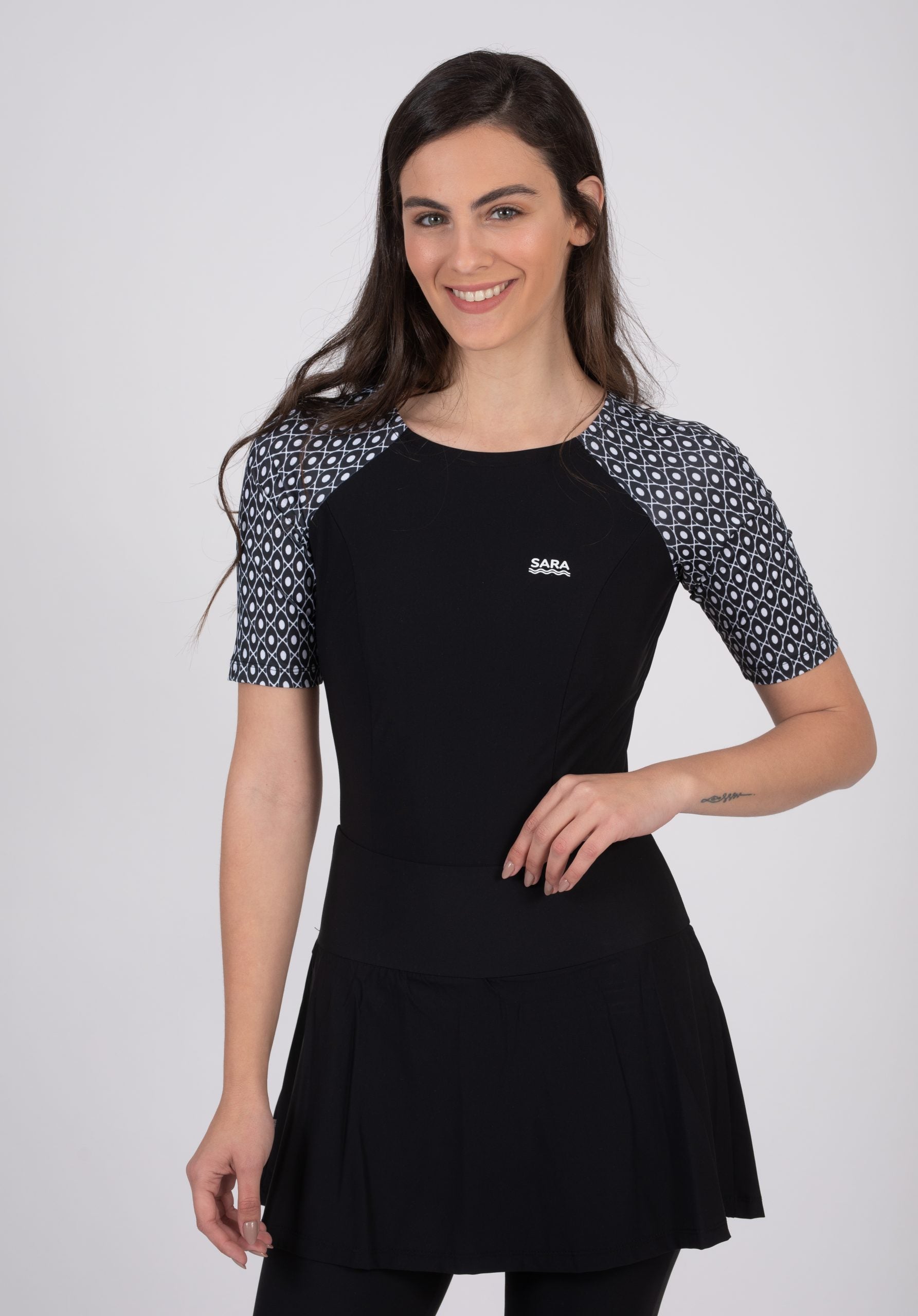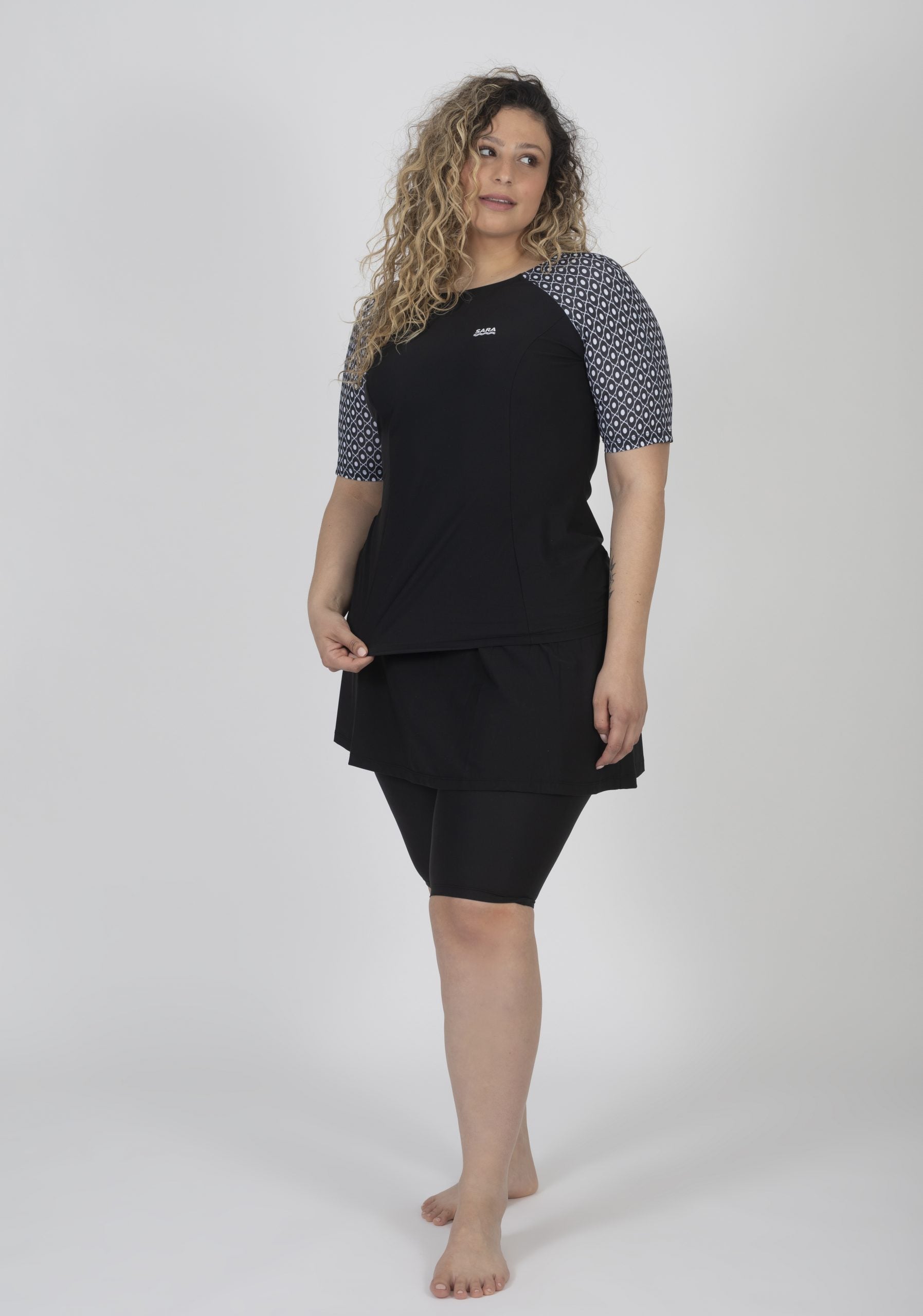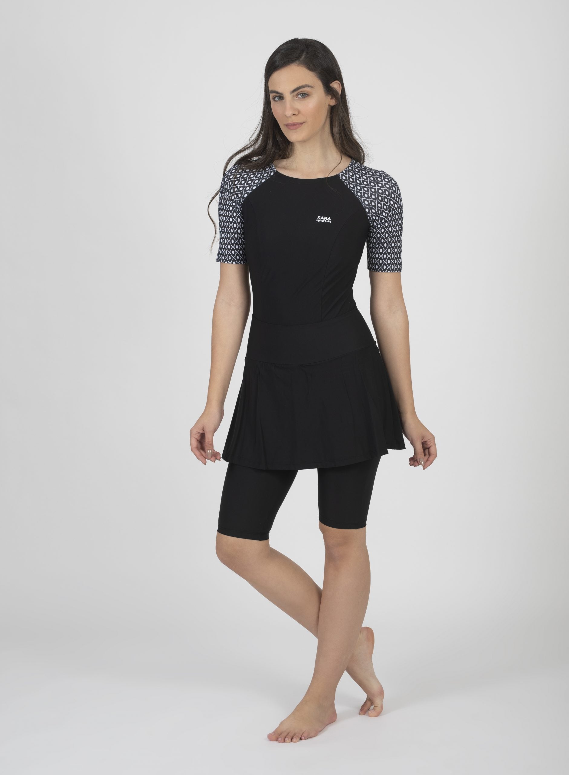 בגד ים דגם חולצה וחצאית מכנס קצרים שחור ולבן